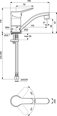 Присъединяване EASY-FIX Гъвкави връзки G3/8" 35 mm керамичен затварящ механизъм с ограничител на топла вода Въртящ тръбен чучур Метална ръкохватка с индикатор за топла и студена вода Аератор Perlator Съответства на стандарт EN817